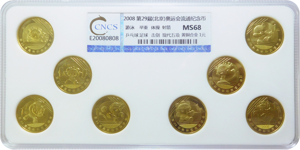 第29屆(北京)奧運會流通紀念幣評級套裝完整收錄了我國2006年發(fā)行至今共三組奧運流通紀念幣8枚,每枚紀念幣面值1元,屬中國法定貨幣。紀念幣面值為1元,正面均為北京奧運會徽及國家體育場俯視圖,背面分別是福娃游泳、舉重、體操、射箭、乒乓球、足球、擊劍、現(xiàn)代五項的運動造型。